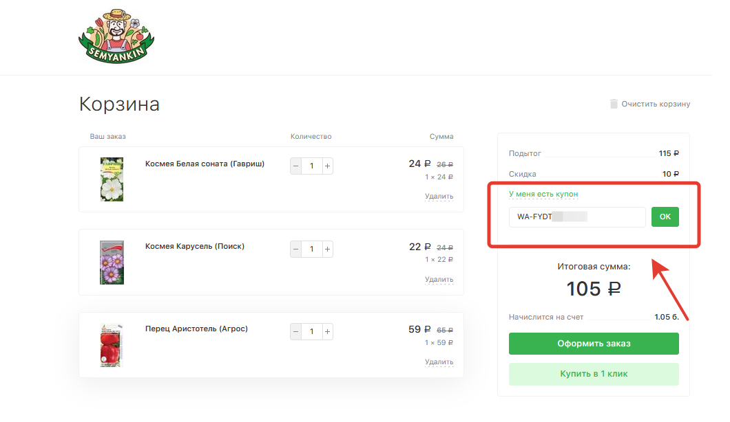 2.1 Купон на разовую скидку 10% на семена* для подписчиков Телеграм канала Семянкин. Купон можно получить в приложении Телеграм, подписавшись на телеграм канал, нажав кнопку "Получить купон на скидку". * - скидка не распространяется на семена Агрофирмы Партнер, семена с ярлыком "Хорошая цена" .